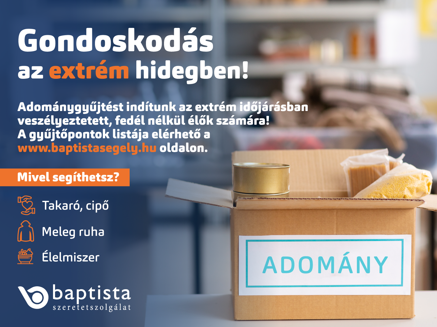 A szervezet gyűjtést kezdeményezett, hiszen nagy szükség van meleg ruhákra, cipőkre, takarókra, hálózsákokra és tartós élelmiszerre is – ezek az adományok azonnal eljutnak a rászorulókhoz.