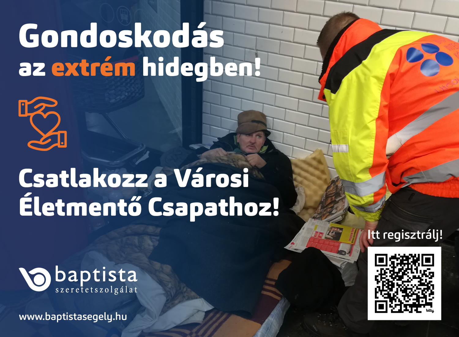 A segélyszervezet egy Városi Életmentő Csapatot hozott létre azzal a céllal, hogy a jelentkezők rövid, de szakszerű felkészítést követően kereshetik fel azokat, akik nehéz, esetleg életveszélyes helyzetbe kerültek. A Baptista Szeretetszolgálat olyan önkéntesek jelentkezését várja, akik szívesen segítik az extrém időjárás miatt fedél nélkül élő embereket Budapesten. A jelentkezéseket az alábbi linken várjuk!